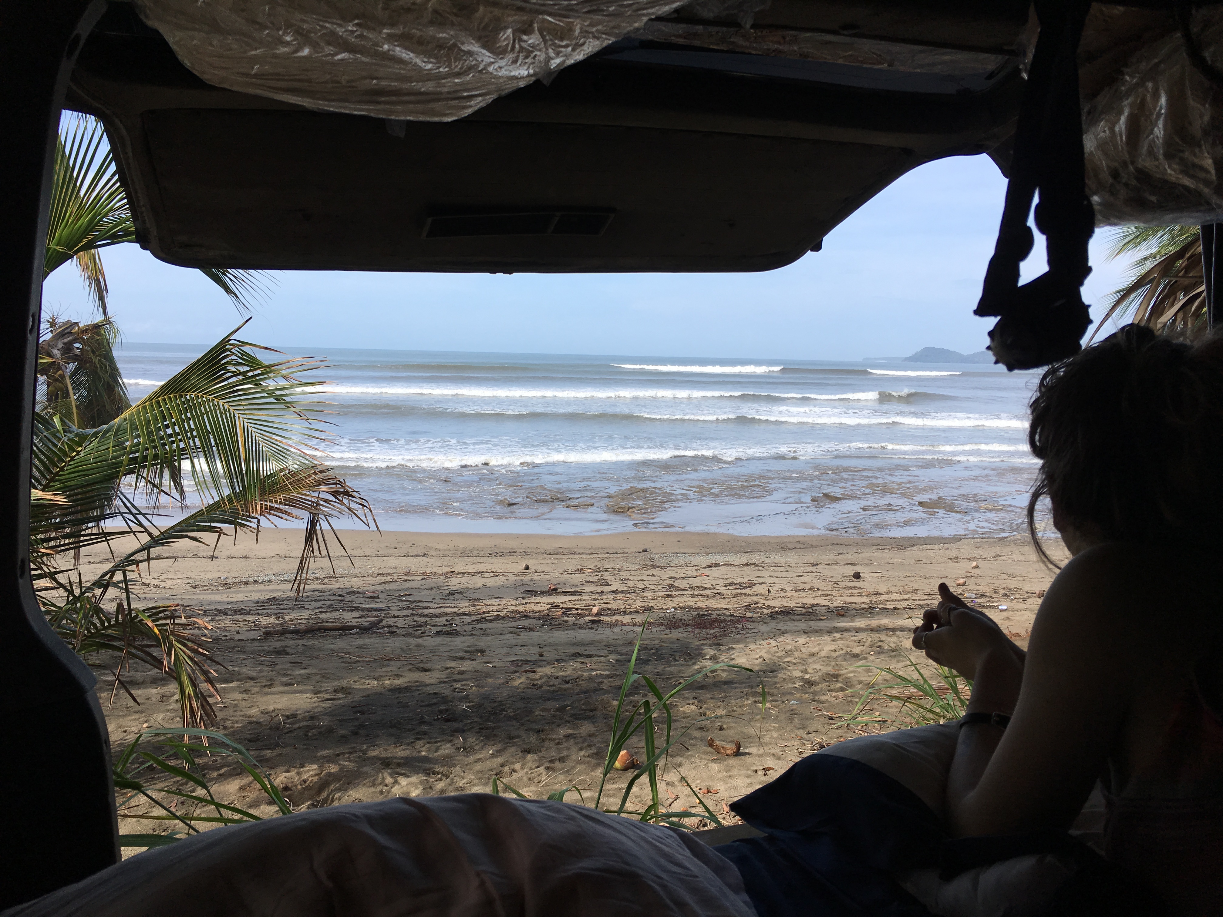 Upon getting reunited and hitting the road we headed to the coast. We went to one of her favorite surf breaks in Veraguas, it was a heavy beach break and we arrived just in time for a big swell. Flash back to a month before I was to leave I was skiing with my sweet friend Maisy when I crashed into a tree and broke my wrist. Long story short my cast was taken off 3 days before I left so when I arrived I was wearing a brace on my wrist everyday, even while surfing. Forgetting about how weak my wrist was and how I hadn’t surfed in ages, that first session I got pretty mauled by the waves. But I was too happy to get down about anything else. I paddled for a few waves and caught a couple but I couldn’t last very long in the water and was getting completely worked when I would try and paddle back out. Lela, my sisters bouncy 7 year old -at the time- Australian Shepard was patiently waiting and guarding our van on the beach. Ella would leave a water bowl for her near the van and poke a stick in the ground and she would obediently sit and wait. Anytime a surfer would go in Lela would excitedly sprint up to them and greet them hoping it was one of us.
